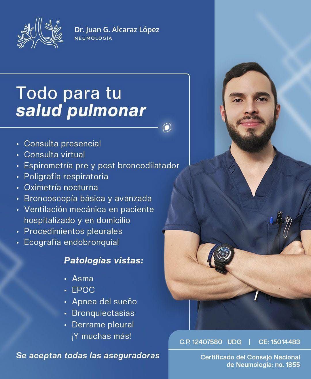Soy médico cirujano y partero egresado del Centro Universitario de Ciencias de la Salud, con especialidad en Neumología realizada en el Centro Médico Nacional de Occidente, en Guadalajara, Jalisco. Cuento con formación adicional en neumología intervencionista en la Clínica Mayo en Rochester Minnesota, Beth Israel Deaconess Medical Center en Boston y en el Instituto Nacional de Enfermedades Respiratorias en CDMX.